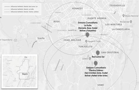 Son tres las experiencias vinculadas a esta investigación: las emisoras comunitarias La Kalle, su red estéreo (hoy Ciudad estéreo), Vientos estéreo y el proceso alter comunicativo Red Loma Sur. Estas son experiencias representativas del quehacer alter comunicativo bogotano, cuyos gestores llevan más de 10 años en el desarrollo de trabajo en el campo de la alter comunicación en el sur de la ciudad; esta trayectoria los legítima como líderes del campo alter comunicativo a nivel distrital y nacional, y a sus experiencias las inscribe como parte de la memoria alter comunicativa colectiva de las comunidades del sur, por su reconocimiento comunitario y en el mismo sector de la alter comunicación bogotana. Al tiempo, los líderes de las experiencias han sido participantes activos en los procesos de deliberación de políticas públicas (distritales y nacionales) vinculadas al sector alter comunicativo.