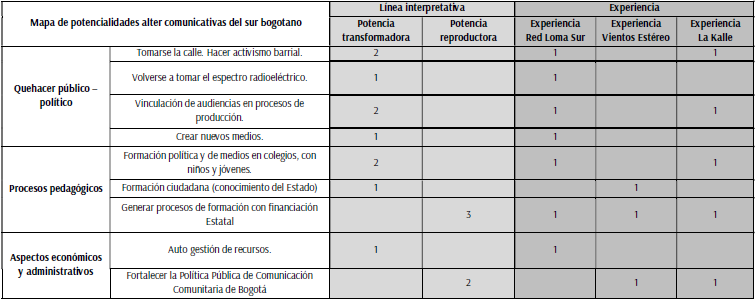 Teniendo en cuenta lo anterior, en esta investigación se establecen una serie de potencialidades que se podrían expresar en función de la acción público – política y formativa de las organizaciones y los actores de la alter comunicación sureña. Estas potencialidades se encuentran latentes sobre el escenario social de la periferia bogotana, y no constituyen, en modo alguno, una oposición a las contradictorias realidades que viven estos actores. Por el contrario, son complementarias a esta realidad. Esto porque lo posible para la alter comunicación sureña no está dado sólo en términos de alternativas para la transformación social desde una perspectiva popular comunitaria, sino que también comprende acciones, pensamientos, quereres y sentires que legitiman y reproducen el régimen socio-comunicativo hegemónico.