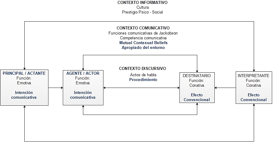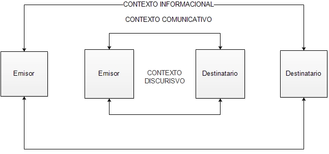 Es necesario precisar que las relaciones entre los cuatro sujetos en un acto comunicativo pueden ser intercontextuales; es decir, el emisor ubicado en el contexto informativo puede comunicarse con el receptor del contexto discursivo y viceversa.