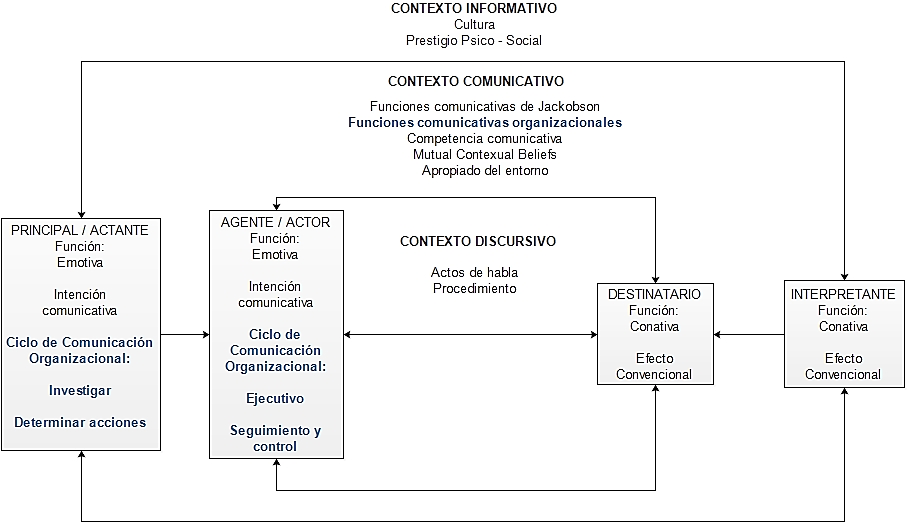Otro aporte desde Taylor y Cooren (1995) es el papel que cumplen los sujetos de cualquier acto comunicativo; el conocido emisor, también trabajado desde Jakobson, puede tener roles diferentes en cuanto a su posición contextual dentro del esquema de comunicación. Por ejemplo, el emisor del contexto informativo será de ahora en adelante llamado Principal/Agente, puesto que este puede ya sea comunicarse directamente con el destinatario o delegar los mensajes a un tercero, en este punto el segundo emisor (ubicado en el contexto discursivo) será llamado Actor/Actante, quien es el responsable de comunicarse directamente con el destinatario. Los destinatarios tienen una suerte similar, desde Charaudeau (1986) se establece al destinatario ubicado en el contexto informativo como Interpretante, ya que en dicho contexto este sujeto no es el directamente implicado en el acto comunicativo. Por lo tanto, como resultado de lo anterior se tiene el siguiente esquema (Ver Figura 2):
