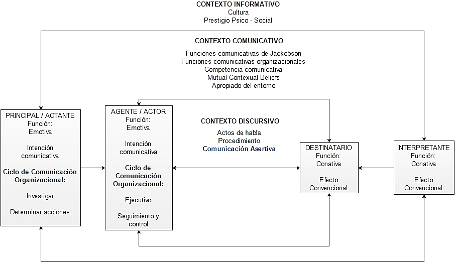 Con el apartado sobre Comunicación Asertiva el esquema de comunicación organizacional se ha ampliado en el contexto discursivo, puesto que dicha comunicación ocurre de manera directa entre los interlocutores con una intención específica, lo cual atañe a los actos de habla (Searle, 2009), en los cuales se reconocen 3 tipos: el acto de emisión[7], acto proposicional[8] y acto ilocutivo los cuales son de 5 tipos: 1. Aserciones, donde se afirma lo que se dice y, por lo tanto, compromete a la persona con lo que esta ha dicho; 2. Directivos, los cuales intentan que el destinatario realice lo que se le está pidiendo; 3. Comisivos, que comprometen al Principal/Actante o Agente/Actor con situaciones que puedan suceder en el futuro, por ejemplo “mañana traigo la factura requerida”; 4. Expresivos, como su nombre lo indica, expresan el estado psicológico de la persona que lo enuncia; aquí se pueden encontrar verbos como: perdonar, agradecer, felicitar. En general verbos que denoten sentimientos personales; 5. Declarativos, los cuales pueden cambiar la realidad de un sujeto, por ejemplo, el gerente de una compañía informa: “esta persona acaba de ser ascendida al puesto de administrador” (Ver Figura 4).