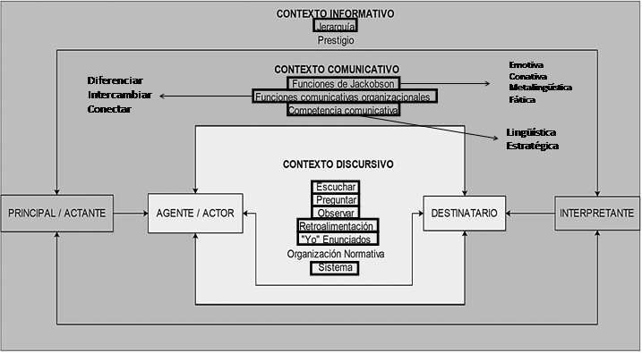 Cabe resaltar que el esquema y sus elementos están organizados en tres contextos comunicativos, los cuales dan un orden y facilitan la comprensión de cualquier acto comunicativo, ya sea formal o informal al interior de las organizaciones.