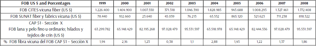 The 78.29% of the FOB values of the exports registered by SUNAT corresponded to the vicuna fiber or hair, 21.71% to vicuna fabrics and 00.1% to vicuna fabric mixed with synthetic or artificial filaments. The tariff headings are found in Section XI "Textile Materials and their Manufactures" and Chapter 51 "Wool and Fine or Ordinary Hair Products; Yarn and Knitting of Crin". If we compare the FOB values of the vicuna fiber registered in the CITES export permits with the SUNAT FOB values of Chapter 51, they represented only on average 1.56% of the value of the fiber Chapter 51 (1999 – 2008) with ranges were from 0.38% to 2.88%. Fiber and vicuna fabrics exported were not significant at the level of total exports of wool and fine hair or yarn and other fiber fabrics at the national level (Table 1).