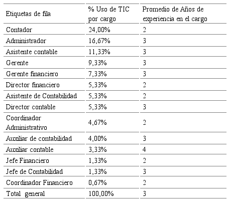 Al analizar los resultados obtenidos, se encuentra: sobre la pregunta ¿Cuál es el cargo que desempeña?, es posible apreciar que los cargos que manejan la mayor parte de la información financiera en las empresas pyme encuestadas, como se presenta en la Tabla 1, son los contadores, quienes representan un 24% del total de los encuestados, seguido de los administradores con un 16.67%. Es también un dato para analizar, que los cargos directivos, como gerentes, directores o jefes, tienen un porcentaje de representación bajo respecto al uso de TIC para el manejo de información financiera, probablemente porque reciben los reportes ya realizados.