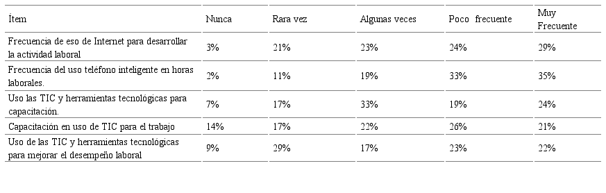Como se observa en la Tabla 2 se resalta al uso del Internet para el desarrollo de las actividades laborales con una frecuencia considerable, pues el 29% de los encuestados aseguran hacer uso de este muy frecuentemente. Así mismo se puede observar el uso de los teléfonos inteligentes en hora laborales con un 35% que admiten usar muy frecuentemente en el desarrollo de sus actividades profesionales. Estos resultados son coherentes con lo descrito anteriormente acerca del uso de estos medios como parte de la era tecnológica presente. Por otro lado, es también de resaltar que el uso de las TIC no se considera tan relevante en el desempeño del trabajo pues no se emplean capacitaciones para su correcto uso y la percepción respecto a la utilidad en el medio laboral no es la mejor. Ello corresponde con los resultados señalados por Cano y Baena (2017) donde la capacitación en TIC es una de las dificultades percibidas para implementar estas novedosas tecnologías.
