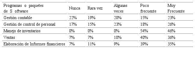 Frente al uso que las empresas le otorgan a programas o paquetes de Software para las diferentes tareas de la organización se puede observar en la Tabla 3 que estos programas son más usados en el manejo de inventarios, ventas y en la elaboración de informes financieros con una frecuencia alta frente al uso para la gestión contable que cuenta con baja participación según los resultados obtenidos.