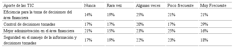 En la Tabla 4 se puede observar cómo es el comportamiento en lo relacionado a los aportes que las empresas consideran que el uso de las TIC les da a los procesos financieros. Es así como procesos como la eficiencia para la toma de decisiones y el control de las decisiones tomadas, son los que se ven más beneficiados con una mayor frecuencia de uso según lo reportado por las empresas. En contraste, no se percibe un gran aporte en la mejora de la administración financiera por el uso de las TIC, y esto puede deberse, como se ha mencionado antes, en el conocimiento de los atributos de programas y tecnologías que pueden utilizarse para mejorar estos aspectos.