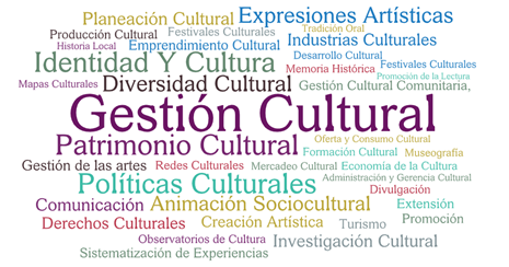 Históricamente se aprecia que, además de la gestión cultural, hay otras categorías como creación artística, expresiones artísticas, patrimonio, gestión de las artes, administración y gerencia cultural, investigación cultural, legislación cultural, formación de públicos, festivales culturales y muestras artísticas, participación cultural, redes culturales, observatorios de cultura, identidad y cultura, diversidad cultural, derechos culturales, producción cultural, economía de la cultura, marketing cultural, mercadeo cultural, animación sociocultural, promoción, divulgación y extensión cultural, industrias culturales, emprendimiento cultural, oferta y consumo cultural, formación cultural, gastronomía, gestión cultural comunitaria, prácticas de la gestión cultural, promoción de lectura, sistematización de experiencias, turismo cultural, historia local y tradición oral, memoria histórica, mapas culturales, metodologías y espacios virtuales, comunicación.