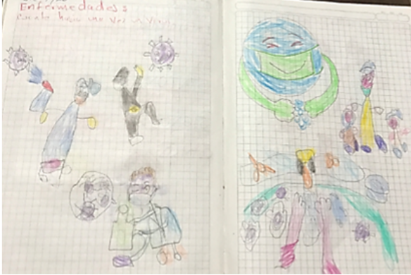 Cuando se trabajó el texto sobre la covid-19 los niños construyeron sus propias expresiones. Algunas respuestas sobre lo ocurrido tienen un mayor nivel de elaboración, un niño de 9 años dijo: “salió una vacuna mala y toca esperar hasta enero que saquen otra vacuna nueva, que la tienen en forma de líquido por el espacio y nos proteja”, con esta respuesta se observa que su capacidad de reflexión es capaz de llevarlo a plantear una posible vía de aplicación de la vacuna; sobre esto, otro niño dijo que “Shlomoh vive en una fantasía donde el virus acabará pronto” reflexión que también puede ser válida dentro de la lógica de lo que puede haber escuchado o vivido.