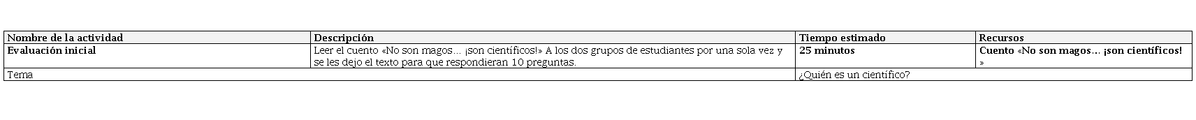 En esta fase se les realizó una actividad inicial de lectura del cuento a cada grupo, se permitió que tuvieran disponible el texto posterior a la lectura y se les pidió responder un cuestionario. En la Tabla 1 se describe la actividad realizada con los dos grupos.
