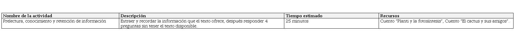 En esta fase se realizó la lectura de dos cuentos presentes en la secuencia didáctica diseñada para este trabajo; sin tener el texto disponible, los estudiantes de los dos grados respondieron algunas preguntas relacionadas con el cuento que les correspondió. La Tabla 2 describe la actividad realizada con los dos grupos.