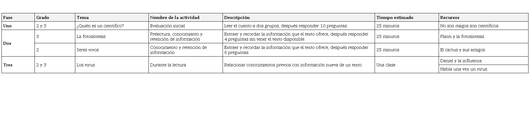 Se escogió como instrumento, un cuestionario con preguntas orientadoras, inicialmente se realizaron pruebas de comprensión lectora para primero determinar el nivel literal, inferencial y crítico, segundo para determinar si la implementación de la estrategia influyó en el entendimiento de textos científicos y el rendimiento académico; para tal fin, se desarrollaron las siguientes fases: