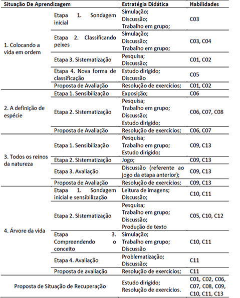 A princípio, a Tabela 3 revela que o material curricular analisado contempla o desenvolvimento de todas as competências previstas pelo currículo paulista para o tema “A diversidade da vida: o desafio da classificação biológica” e, consequentemente, das modalidades de conteúdos curriculares derivadas destas. Considerando ainda as estratégias didáticas sugeridas pelo caderno do professor – principalmente a discussão, a pesquisa, a simulação e o trabalho em grupo –, verificamos que estas apresentam consistências com as competências previstas, possibilitando sua abordagem por meio de situações distintas, concordando assim com os apontamentos de Zabala e Arnau (2010) que, dentre outros, destacam a importância do oferecimento de atividades que contemplem situações significativas e funcionais para que competências sejam desenvolvidas e mobilizadas em escalas crescentes de complexidade e independência por parte dos sujeitos.