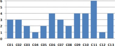 A Figura 1 evidencia que as competências são mobilizadas de modo desigual pelo currículo paulista. Desta maneira, enquanto observamos a ocorrência de competências que são extensamente trabalhadas ao longo do material curricular analisado (como, por exemplo, C06, C09, C10, C11 e C13), verificamos também a existência daquelas que são abordadas somente uma vez pelo caderno do professor (C04 e C12). Este tratamento desigual contraria as orientações de Zabala e Arnau (2010) no que diz respeito à exercitação tutelada e reflexiva, pois, segundo os autores, faz-se necessário que sejam oferecidas ao aluno múltiplas situações para que o mesmo exercite, com maiores ou menores contribuições do professor e/ou de seus pares, as competências estimadas como importantes para uma dada área do conhecimento.