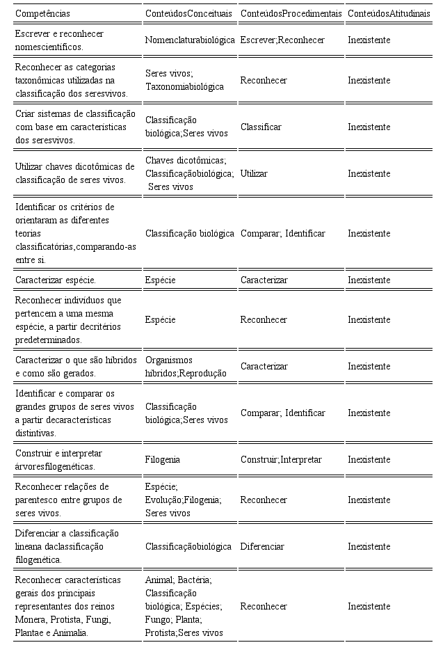 (2) identificar os possíveis conteúdos conceituais, procedimentais e atitudinais vinculados às competências relativas ao tema “A diversidade da vida: o desafio da classificação biológica” presentes nos documentos oficiais da educação básica paulista;