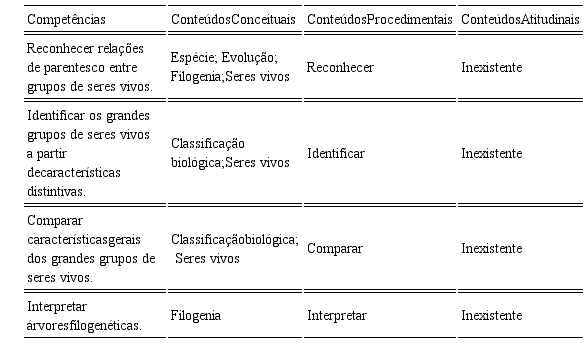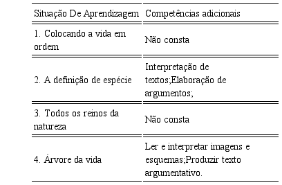 Por sua vez, as Matrizes de Referência para a Avaliação SARESP estimam como necessárias quatro competências vinculadas à temática “A diversidade da vida: o desafio da classificação biológica”. Este documento oficial apresenta menos competências em relação ao currículo paulista, pois sua inclusão nas matrizes inviabilizaria sua avaliação por meio de instrumentos como o SARESP. Todavia, é ressaltado que este número superior de competências presente no Currículo do Estado de São Paulo deve ser trabalho em sala de aula e constituir a avaliação formativa contínua praticada pelos professores (SÃO PAULO, 2009A). Considerando ainda que o currículo paulista e as Matrizes de Referência para a Avaliação SARESP foram elaborados de modo imbricado, as competências presentes neste último documento são encontradas, com maior ou menor semelhança de redação, no Currículo do Estado de São Paulo.