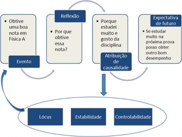 No esquema representado na Figura 1, sintetizamos a ideia da Teoria da Atribuição de Causalidade com o seguinte exemplo: um aluno obteve uma boa nota em Física. Após passar pelas etapas apresentadas, sua atribuição (explicação) terá um Lócus (nesse caso, interno), uma controlabilidade (controlável) e uma estabilidade (estável). Com isso, um novo evento, por exemplo, obter novamente uma boa avaliação nessa disciplina trará emoções e significados familiares a esse sujeito.