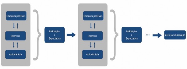 Silvia e Kashdan (2009) explicam que o interesse motiva as pessoas a tentarem compreender coisas novas, conflitivas ou complexas. Se elas alcançam seu objetivo (compreender), sentimentos positivos como a alegria ou contentamento devem ser gerados. Da mesma forma, os sentimentos positivos tornam as pessoas mais dispostas a experimentar coisas novas e mais confiantes sobre sua capacidade de compreendê- las, tal qual a autoeficácia. Portanto, pessoas que experimentam experiências positivas em relação à Física e têm crenças de eficácia elevadas são mais susceptíveis a desenvolverem um interesse duradouro e optarem por uma carreira ligada a esta área em comparação a outras pessoas que não experimentaram emoções semelhantes.