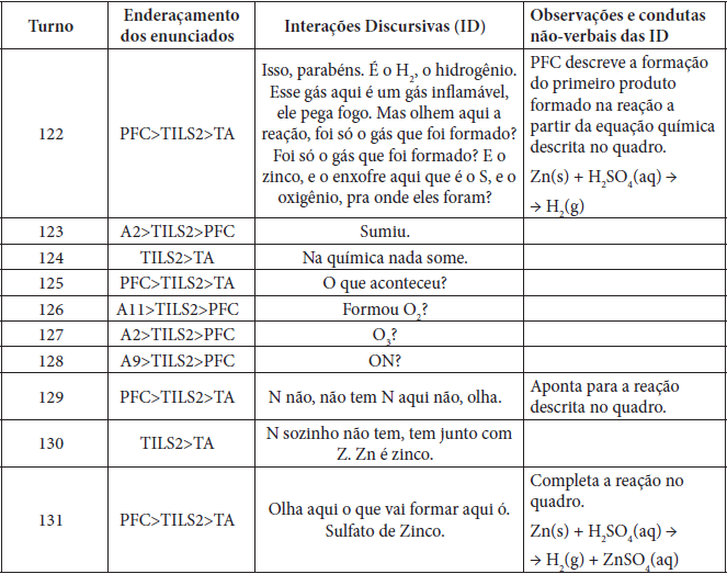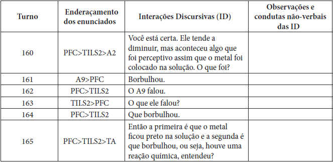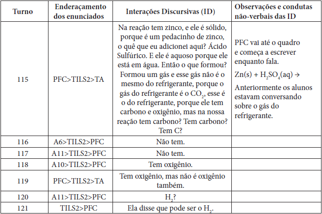 É importante ressaltar o fato de que os alunos não recordaram da liberação de gás na reação, fato percebido apenas quando PFC, no turno 160 a partir do enunciado, contribuiu para um insight por parte dos alunos. Como é possível observar no episódio de ensino 6, A9 descreveu que houve a formação de borbulhas, e, então PFC no turno 165 concluiu que podemos observar a ocorrência de uma reação química pelo escurecimento do metal e liberação de gás.