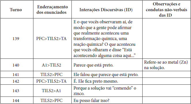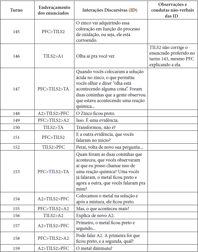 O A1 no turno 140 foi o primeiro a dizer que o metal estava preto, entretanto nesse momento, TILS2 (turno 143) fornece a explicação para A1, de que o motivo para o escurecimento do zinco era porque a solução estava “comendo” o zinco. A escolha léxico-semântica de TILS2 não foi acertada e parece que TILS2 compreende o fato, pois pergunta a PFC no turno 144 se poderia falar dessa forma. No turno 145, PFC explica cientificamente a questão para TILS2, entretanto TILS2 não encaminha a mensagem para A1.