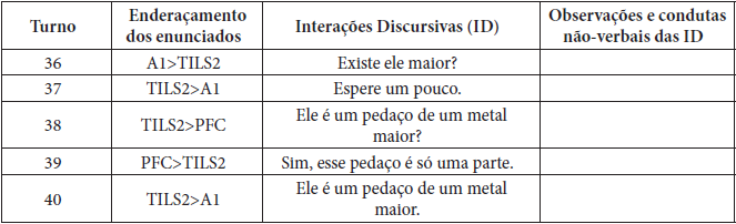 No turno 24, PFC pergunta “Onde é utilizado esse metal?” e então em seguida na tentativa de responder à pergunta de PFC, A1 oferece no turno 26, a réplica “Isso é uma diminuição do zinco (Zn). Existe ele maior?”. Neste trecho do episódio observamos, a partir do excedente de visão propiciado no turno 24 (Observações e condutas não- verbais das ID), que os alunos estavam presos ao concreto, ou seja, novamente ao aspecto observável empiricamente, porque o TILS2 intermediou a pergunta de PFC remetendo à utilização do fragmento de metal (zinco), que havia sido recortado propositalmente para utilização durante a atividade de experimentação, ou seja, a pergunta de A1 parece trazer indícios de que um fragmento tão pequeno não poderia ter alguma utilidade.