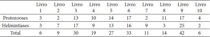 Nos livros analisados os temas, helmintíases e protozooses, estão contemplados em capítulos junto a outros temas. As protozooses estão apresentadas nos capítulos: Reino Protista (1, 4, 7 e 8), Protozoários, Algas e Fungos (2, 6), Protozooses e Doenças Sociais (3), Protozoários e Algas (5 e 10) e Seres vivos muito pequenos (9). As helmintíases estão distribuídas nos capítulos: Platelmintos e Nemátodos (1 e 9), Platelmintos, Nematódeos e Moluscos (2 e 10), Helmintíases: doenças negligenciadas (3), Platelmintos e Nematódeos (4 e 5), Animais invertebrados (6), Diversidade de invertebrados (7) eDiversidade animal (8).