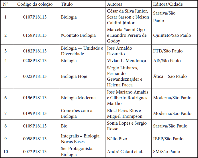 Realizou-se entre os meses de maio e junho de 2019, uma busca in loco das 10 coleções de Biologia aprovadas pelo PNLD para o triênio 2018/2020, conforme a Figura 1.