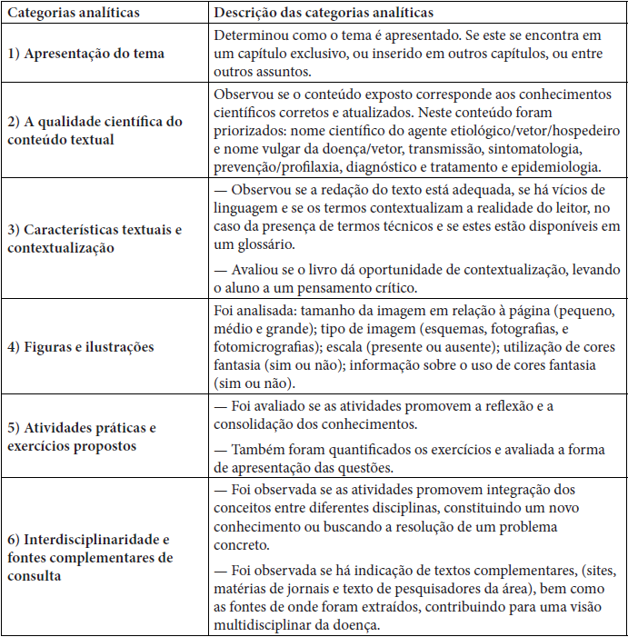 A avaliação dos temas relacionados à Parasitologia nos livros didáticos não se caracteriza por uma prática nova (Jotta & Carneiro, 2009; Schall, 2010; Orlandi, 2011; França et al., 2011; Murta et al., 2014). A tendência maior indica a análise de seus conteúdos, visando identificar, principalmente, erros conceituais e ilustrações equivocadas (Schall, 2010, França et al., 2011, Murta et al., 2014).