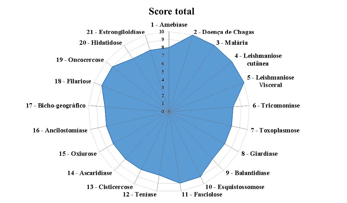 As variáveis contempladas, no item 2 da Figura 2, foram apontadas e apresentadas em gráfico em forma de radar (Figura 3). Os itens relacionados a qualidade científica do conteúdo textual foram apontados em (1) presença e (0) ausência a soma de todos os critérios foi de 180 pontos e representa o score total de cada parasitose analisada.