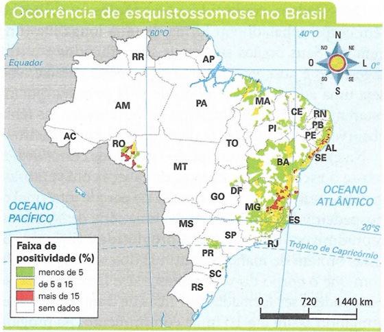 A única helmintíase que foi contemplada em mapas foi a Esquistossomose (6 e 10). Vale ressaltar que o livro 10 traz o mapa da distribuição geográfica da Esquistossomose no Brasil em 2014 (Figura 4) com indicação de casos de alta endemicidade no estado de Rondônia. Segundo Katz (2018), autor do Inquérito Nacional de Prevalência da Esquistossomose mansoni e Geo Helmintíases (2010–2015), o estado não está mais inserido na área endêmica da doença.