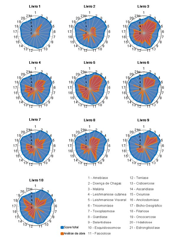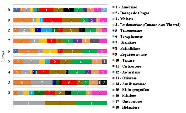 m relação aos protozoários, todas as coleções fizeram referência à Malária, Doença de Chagas e as Leishmanioses. A Toxoplasmose foi abordada em oito obras (1, 2, 3, 4, 5, 7, 8 e 9), a Amebíase (3, 4, 5, 6, 7, 8 e 10) e Giardíase (1, 2, 3, 4, 5, 8 e 10) porsete e a Tricomoníase por seis (2, 3, 4, 5, 7 e 8). A Balantidíase foi abordada por duasobras (3 e 8).