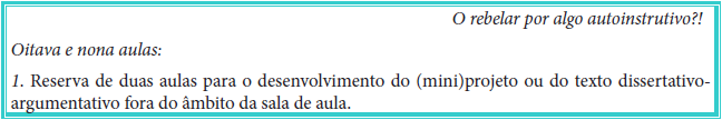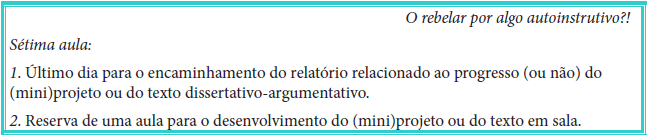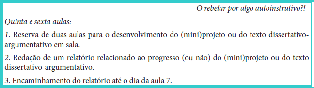 Com o início efetivo dos (mini)projetos e dos textos dissertativo-argumentativos, a quinta e sexta aulas (Figura 8) são disponibilizadas – no âmbito da sala de aula – aos(as) estudantes para o impulsar do avanço de seus artefatos. O(A) facilitador(a) encontra-se disponível para auxiliá-los(as) no que for preciso; ele(a) busca, reuni e avalia materiais e informações sobre “[...] recursos que poderão proporcionar aos[(as)] alunos[(as)] uma aprendizagem através da experiência correspondente a necessidade deles[(as)]” (Parisoto et al., 2016, p. 196). Além disso, ele(a) pode realizar algumas sessões de feedback com os(as) estudantes. Ao término da sexta aula, o(a) facilitador(a) pode vir a solicitar aos(as) alunos(as) a redação de um relatório relacionado ao progresso de seus (mini) projetos ou de seus textos dissertativo-argumentativos; sendo necessário encaminhá-los até a aula de número 7 para apreciação e contribuição do(a) facilitador(a).