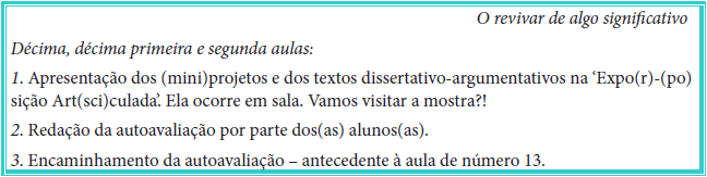 Assim, mediante a temática, a proposta pode ser introduzida nos primeiros dias da disciplina a ser escolhida. Para sua implementação são devaneadas 13 aulas; estas, por sua vez, são agrupadas em 3 etapas. Na primeira delas (O rebelar por algo autoinstrutivo?!), ocorre a contextualização da ‘Expo(r)-(po)sição Art(sci)culada’, a explicitação de seus objetivos e a execução de seus procedimentos. No segundo momento (O revivar de algo significativo), há a apresentação de (mini)projetos ou de textos dissertativo-argumentativos desenvolvidos pelos(as) aluno(as). Em um último estágio (O (re)contar de mundos), ocorrem (auto)avaliações e outras ponderações.