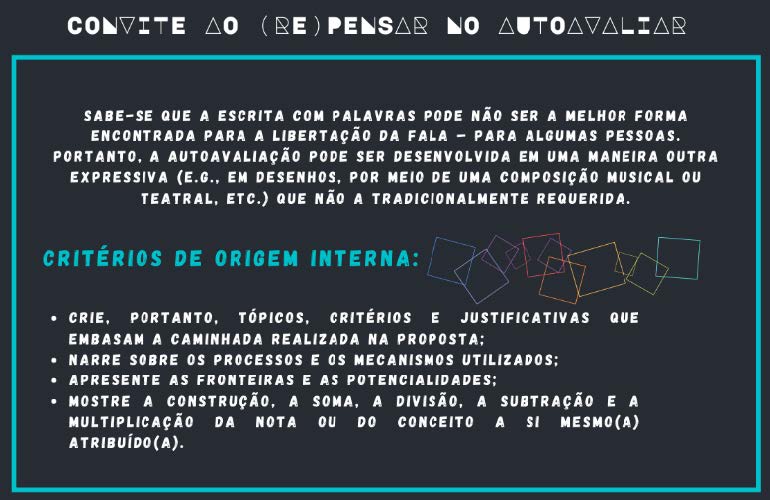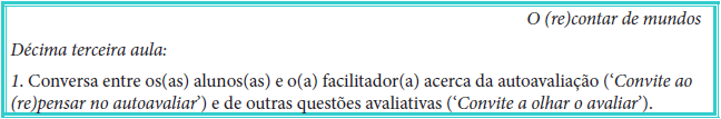 Após o término da exposição, o(a) facilitador(a) pode vir a solicitar aos(as) alunos(as) a construção da redação de uma autoavaliação (‘Convite ao (re)pensar no autoavaliar’) para ser entregue com antecedência à aula 13 (Figura 12). Nesta última etapa, do terceiro momento da implementação da proposta, cada “[...] pessoa tem de assumir a responsabilidade de decidir quais os critérios importantes para si, que [...] objetivos [...] tenta atingir e a extensão até onde os atingiu, [...] aprende[ndo] a ser responsável por si próprio[(a)], e por suas decisões” (Rogers, 1978, p. 145).
