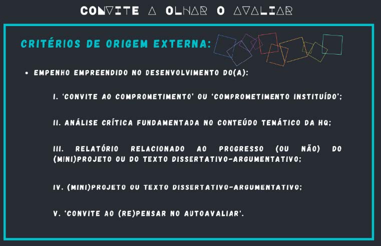Para se chegar a uma avaliação total dos fatores derivados da proposta (i.e., dos itens i, ii, iii, iv e v presentes no ‘Convite a olhar o avaliar’), sugere-se uma forma global de análise (Rogers, 1978); na qual o(a) facilitador(a) busca, conforme os objetivos expressos pelos(as) alunos(as) no ‘Convite ao comprometimento’ e no ‘Comprometimento instituído’, verificar se os (mini)projetos, os textos dissertativo-argumentativos e outros trabalhos desenvolvidos estão ancorados “[...] [n]esses objetivos [...], a fim de [se] chegar a uma visão global da sua atividade” (Ibidem, p. 57) humana.