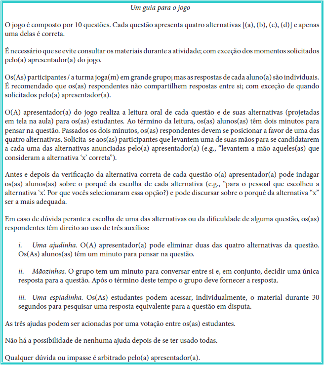 Em termos práticos, em uma aula primeira — introdutória de apresentação da disciplina — o(a) professor(a) pode solicitar a leitura prévia da primeira parte da HQ e de seu texto associado para a realização de um jogo na aula do dia dois. No segundo dia (i.e., o primeiro dia de efetiva implementação deste modo alternativo da proposta), pode promover uma explanação geral (contextualização) sobre o material, com auxílio do recurso Prezi ou de outro, objetivando particularmente sanar eventuais dúvidas por parte dos(as) estudantes a partir um breve seminário. Em seguida pode iniciar um jogo11 (Figura 15) de perguntas e respostas, inspirado em Jorge (2018), relacionado ao conteúdo-temático abordado na primeira parte do material.