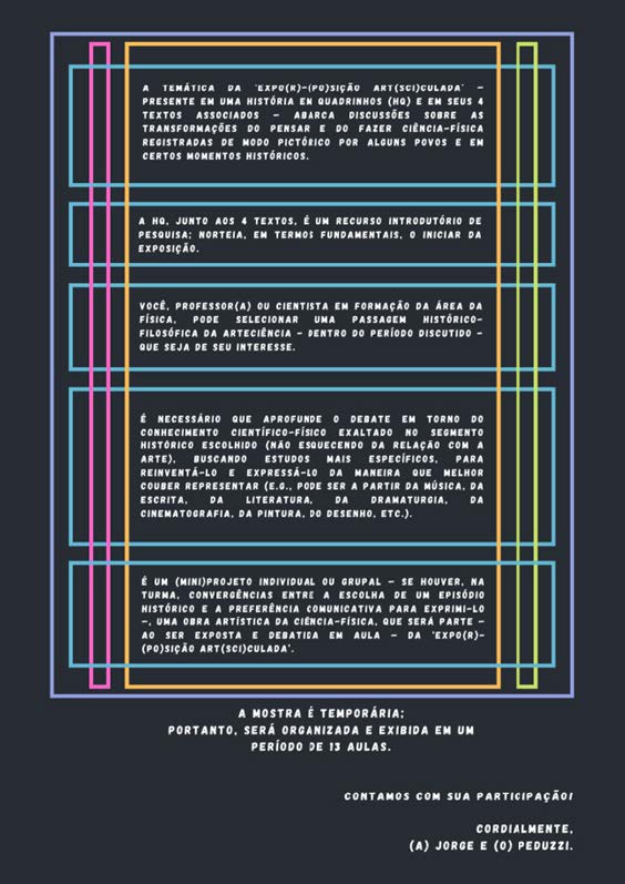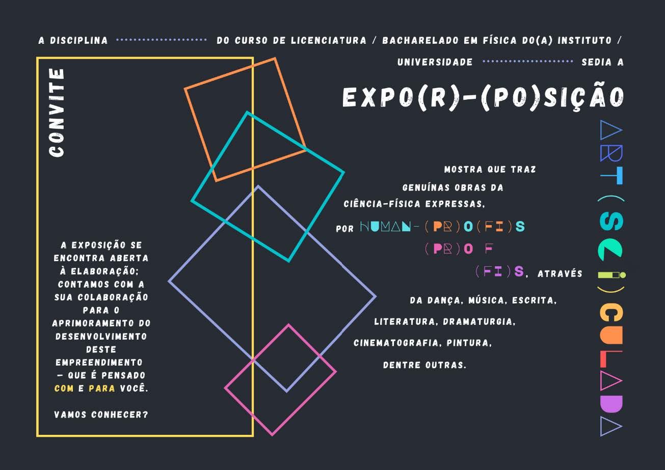 Antecipadamente ao dizer: “— Isso não dá!” ou “— Não vai funcionar!”, procura- se, aqui, experienciar em um fundamentar. Auxiliar no pensar de objetivos e cenários para uma proposta de exposição art(sci)culada. Um lugar que possa: (A) encorajar a realização de escolhas e o responsabilizar pelas consequências das mesmas na perspectiva Carl-Natalie-rogeriana e feyerabendiana; (B) dar boas-vindas a riqueza de ferramentas (e.g., artigos, laboratório, aparelhos sonoros, instrumentos artísticos, etc.) — tudo, dentro do que se faz possível ou se tem disponível, para alimentar os interesses dos(as) estudantes (Rogers, 1978); (C) praticar a pluralidade por meio do desenvolvimento de projetos; (D) (re)aproximar a arte da ciência e vice-versa; e (E) (re)humanizar o conhecimento físico, bem como as práticas pedagógica e científica.