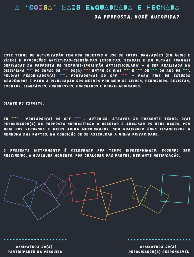 Ainda no dia prima, após a apresentação do ‘Convite a participar e partilhar’, se destina a ‘(RE)Programação do evento’10 aos(as) estudantes — uma ementa da proposta devaneada para 13 aulas de implementação. Na sequência, se busca encaminhar ‘A ‘coisa’ mais enquadrada e fechada da proposta. Você autoriza?’ (Figura 2); uma declaração de participação na pesquisa. Nela os(as) alunos(as), no que confere o direito de compor parte da investigação, assinam (ou não) um termo de autorização para a liberação de informações produzidas durante a realização da ‘Expo(r)-(po)sição Art(sci)culada’ — para fins de estudos e de divulgação científico-acadêmica (com o anonimato dos(as) participantes assegurado).