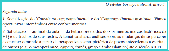 Na segunda aula (Figura 5), se facilita um espaço para o colóquio de ideias, concepções,percepções,sugestões,objetivosecaminhospensadosparaosdesdobramentos dos futuros (mini)projetos e dos textos dissertativo-argumentativos. É um ambiente convidativo. Um universo propício à socialização do ‘Convite ao comprometimento’ e do ‘Comprometimento instituído’; pois, intensifica e potencializa a interação entre os(as) alunos(as), bem como entre estudantes e facilitador(a), ao contribuírem com perspectivas novas e ao sugerirem coisas outras a aqueles(as), ainda, em dúvida. Isto suscita, ademais, intercâmbios e oportuniza a relação de conhecimentos plurifacetados— em um modo que lembra o relativismo prático feyerabendiano (Feyerabend, 2010). No cessar dos ponderamentos, frente a integridade dos (mini)projetos e dos textos dissertativo-argumentativos dos(as) envolvidos(as), o(a) facilitador(a) sugere como leitura necessária — para a aula de número 3 — os dois primeiros marcos históricos presentes na HQ e, como leitura complementar, alguns trechos dos 2 textos a eles associados.