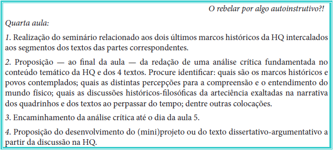 Na quarta aula (Figura 7) ocorre o segundo seminário elaborado pelo(a) facilitador(a) referente aos 2 últimos marcos históricos presentes na HQ e nos textos relacionados. Ao término da aula, solicita-se a realização de uma análise crítica fundamentada no conteúdo temático integral da HQ e dos 4 textos que deve ser encaminhada ao(a) facilitador(a) até a aula de número 5.