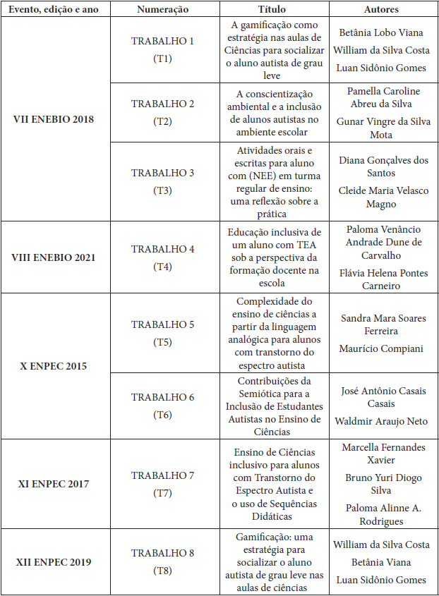 Esta pesquisa buscou analisar a produção científica sobre a inclusão de alunos com TEA nos anais do ENEBIO e do ENPEC no período de 2010 a 2020.