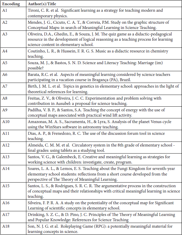 Based on the theoretical appropriation of the content of these articles, five categories were proposed for classification, analysis and discussion: two of the a priori type established prior to reading,— (i) Reference authors in relation to the Theory of Meaningful Learning and (ii) Methodological Approach(s) — and three of the emerging, post-reading, type — (iii) Scientific literacy and its potential contributions to science education, (iv) The student as an active/participatory subject in his/her learning and (v) Use of digital technologies as a qualification strategy for science teaching.