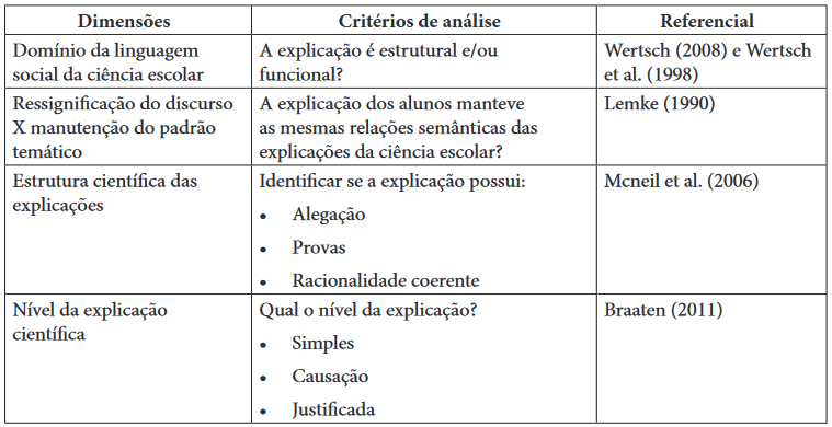 Na segunda fase — fase de construção do artefato — soluções potenciais são exploradas e precisam ser checadas se são factíveis, com base na análise do problema e nas orientações teóricas. McKenney e Reeves (2019) comentam que esta fase de design e construção envolve interações sociais e uso dos achados da revisão de literatura. Por isso, utilizamos os aportes teóricos de alguns trabalhos (Braaten & Windschitl, 2011; Lemke, 1990; Mcneil et al., 2006; Wertsch et al., 1998) para estudar os aprendizados da estrutura científica e nível de explicação construídas pelos alunos após a intervenção. Por exemplo, a figura-1 orienta sobre critérios de análise desenvolvidos neste trabalho.