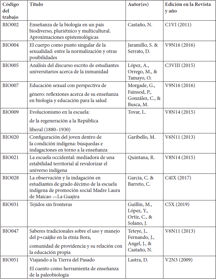 La búsqueda fue realizada en todos los volúmenes y números de las publicaciones corrientes de la REBIO disponibles en la página web de la revista, los cuales comprenden 27 números distribuidos en 14 volúmenes entre el periodo de 2008 y julio de 2021. La búsqueda también se realizó en las cinco ediciones extraordinarias publicadas por la REBIO en las cuales se reúnen las memorias de las ponencias, talleres y relatorías presentadas en las cinco versiones de los Congresos Nacionales de investigación en enseñanza de la biología, que se desarrollan en conjunto con los Encuentros Nacionales de Experiencias en Enseñanza de la Biología y la Educación Ambiental, realizados cada dos años, en Colombia, desde 2011 hasta 2019. Por último, también se realizó la búsqueda en los trabajos publicados por la REBIO en 2016 como edición extraordinaria, reuniendo las memorias del evento denominado Primer encuentro ambiental universidad, ambiente y sustentabilidad: experiencias y prácticas.