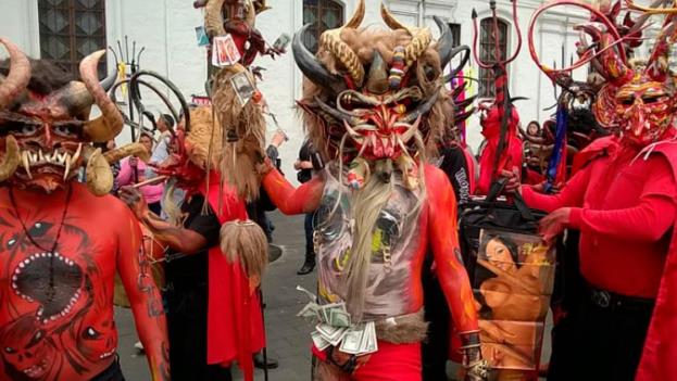 “Supay tukushkakunaka manatak illaytukunchu ashka raymikunapi tukuy Ecuador mamallakta ukupitak llaktakunapipish, shuktak shina churaykunawan shinallatak shuktak tushuykunawan paktashpa rikurinmi.”. Ayllu (Diablos: símbolo de la alegría popular 2018)