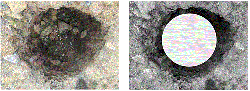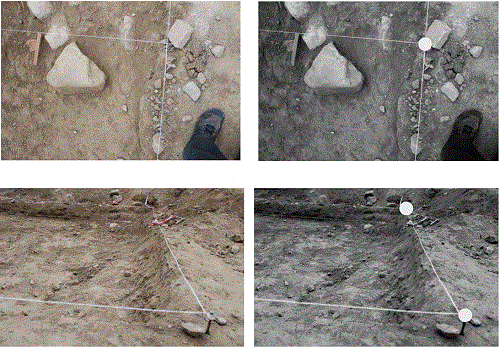 . Dot as point: this pair shows the nails used to keep the threads of the trench. These two points are markers in the landscape of the site, and requires a careful attention to not to move them. Even several forces (hits with a hammer, stones, and nails pressure) would be mobilized to make them stable points. Once the trench has been excavated, these nails are keep as axis of the internal order of the practice. Also they marks the boundaries of the site and represent a physical path in which significant elements are exported and imported to inform the next steps of the excavation. As almost the unique fixed point in a fluid practice, all depends of its maintenance. After the excavation, the little holes left by them, in case to being removed, will be there as much as the earth of the site in the iron surface of the nail (Figure 2).