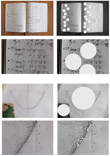 . Dot as concept: this pic shows the record sheets to document the archaeological findings. These sheets are analogue to the camera, in the sense they works in the same way instrumentalizing real phenomena. The conceptualization of the stone structures is done first with a textual description of its main characteristics, then with a draft drawing through which measures, locations, coordinates, and are recorded. This is the creation of points from points to make more points in the maps and publications (Figure 9).