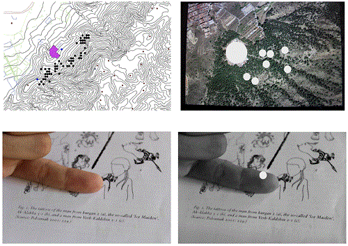 . Dot as anatomy: maps represent several geographical features. Since what are represented is the relevant elements for the research, and the research is conducted by human aspirations guided by materiality, the map would incorporate a sensual geography of landscape. Not just geographical information, but also paths, remains, special places to be remembered. The points of the maps are not only passive representation of visited places, but also a projection of memories and possible possibilities for future. This kind of points could be also iconic representations showing how the corporal movements in the space (Figure 6) are.