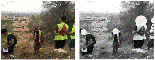 . Dot as bodily experience: our bodies are part of the landscape of the research. On fieldwork, archaeologists with reflecting vests are material points in this landscape. However, for foreigners and for the ethnographer, they are part also of the wider natural environment. Being points, their engagement with the field happens through artificial understanding of nature (Figure 8).