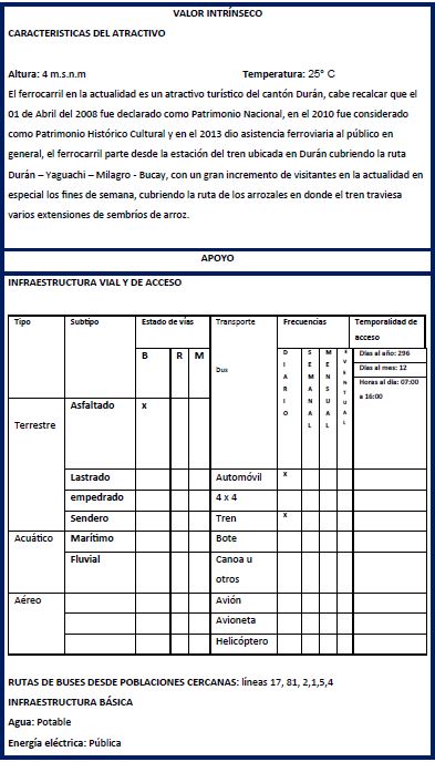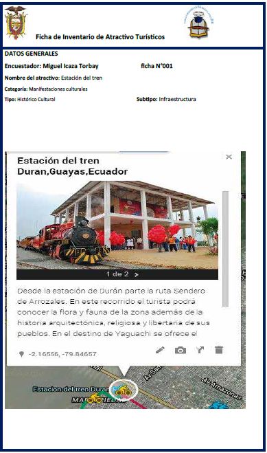 Para diseñar el circuito ciclístico, se partió de identificar los atractivos turísticos más representativos del cantón Durán y se recolectó información por medio de Fichas de inventario de atractivos, similares a las que tiene el MINTUR, tal y como se puede apreciar en la Figura 1.